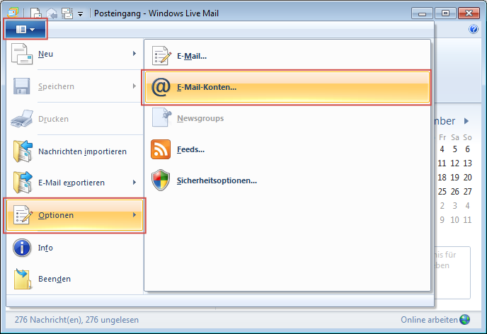 Öffnen Sie Windows Live Mail, klicken Sie auf den blauen Menüknopf und wählen Sie im erschienen Auswahlmenü unter Optionen E-Mail-Konten aus.