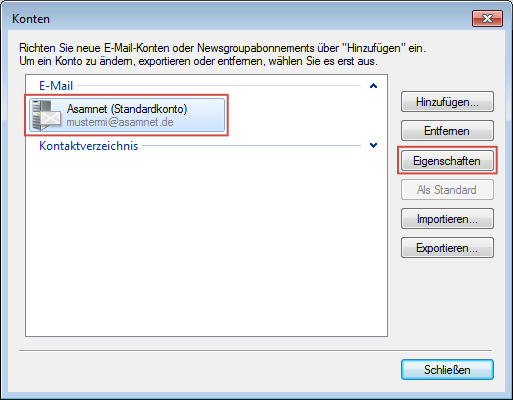 Wählen Sie Ihr ASAMnet-Konto in der Liste aus. Windows Live Mail bennennt die Konten in der Standardeinstellung nach der verwendeten E-Mailadresse, also z.B. "mustermi@asamnet.de". Wenn Sie dafür manuell eine andere Bezeichnung vergeben haben oder mehrere Postfächer haben, kann das Konto möglicherweise auch anders heißen. Haben Sie Ihr ASAMnet-Konto ausgewählt, klicken Sie als nächstes auf Eigenschaften.